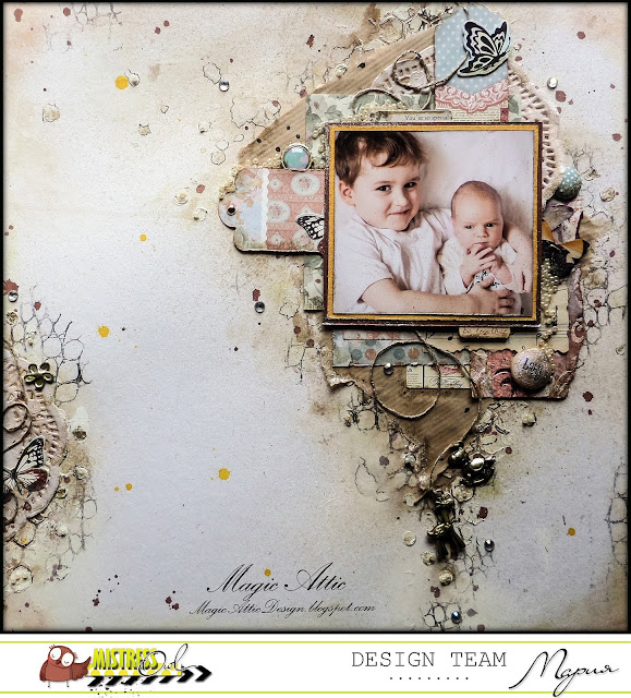 Я сделала легкую миксмедийную страничку про своих деток, приклеила ее на картон и повесила в детской. Экспозиция на стенах должна регулярно обновляться :)